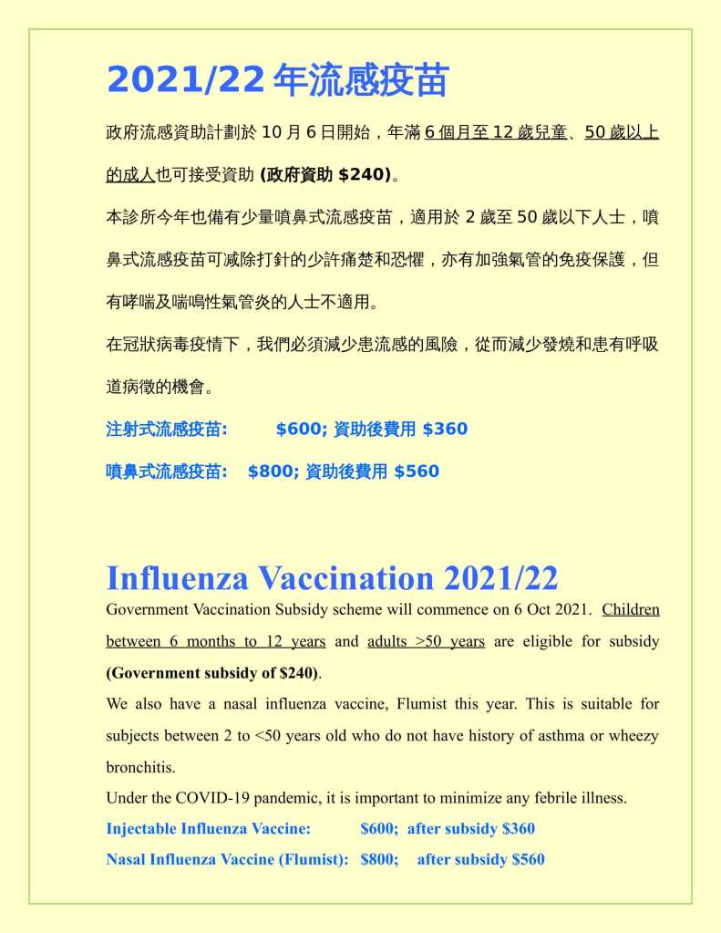 *流感疫苗的品種是根據世界衛生組織推算來年最有可能遇到的流感品種而製定現時本診所採用四價流感疫苗,每針收費為 $600。疫苗資助計劃會於月開始,滿六個月至未滿十二歲或仍就讀於小學的學童會獲取政府 $240的資助。